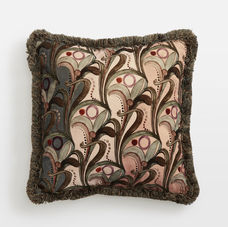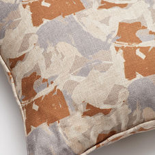 Hand painted ikat designs digitally printed onto tumbled, slubby linens with a variety of trims and finishes.